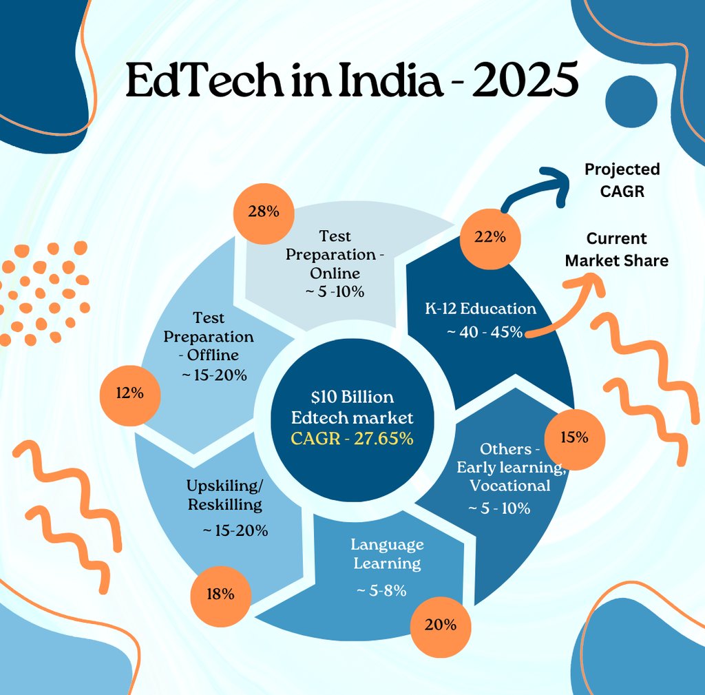 India’s EdTech market is projected to reach $10 billion by 2025, growing at a CAGR of 27.65% — a clear sign that digital learning is becoming mainstream across all age groups.